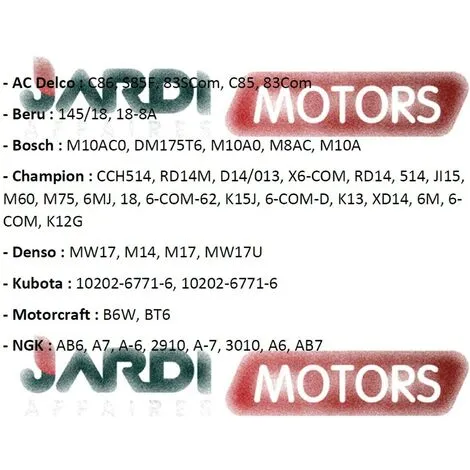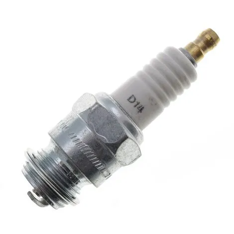 Bougie d’allumage Champion D14 pour moteur Cushman, Onan, GRAHAM PAIGE, Briggs & Stratton, ROTOETTE, ROTOTILLER, CONSOLIDATED, DELCO-LITE, DUPLEX, FAIRBANKS MORSE, HOMELITE, Wisconsin, POWERLITE, U.S. MOTORS, WECO, WESTINGHOUSE, WITTE, DORMAN, Continental… Dimensions de la bougie Champion D14 : Taille de la clé 6 pans : 23mm, Filetage diamètre M18x1.5mm, Longueur de filetage 12.7mm Retrouvez notre tableau de correspondance (NGK, Bosch, Denso, Torch…) pour vérifier avec votre référence de bougie et commander le bon modèle pour votre moteur. Jardiaffaires c’est plus de 60 références de bougies Champion en stock permanent.